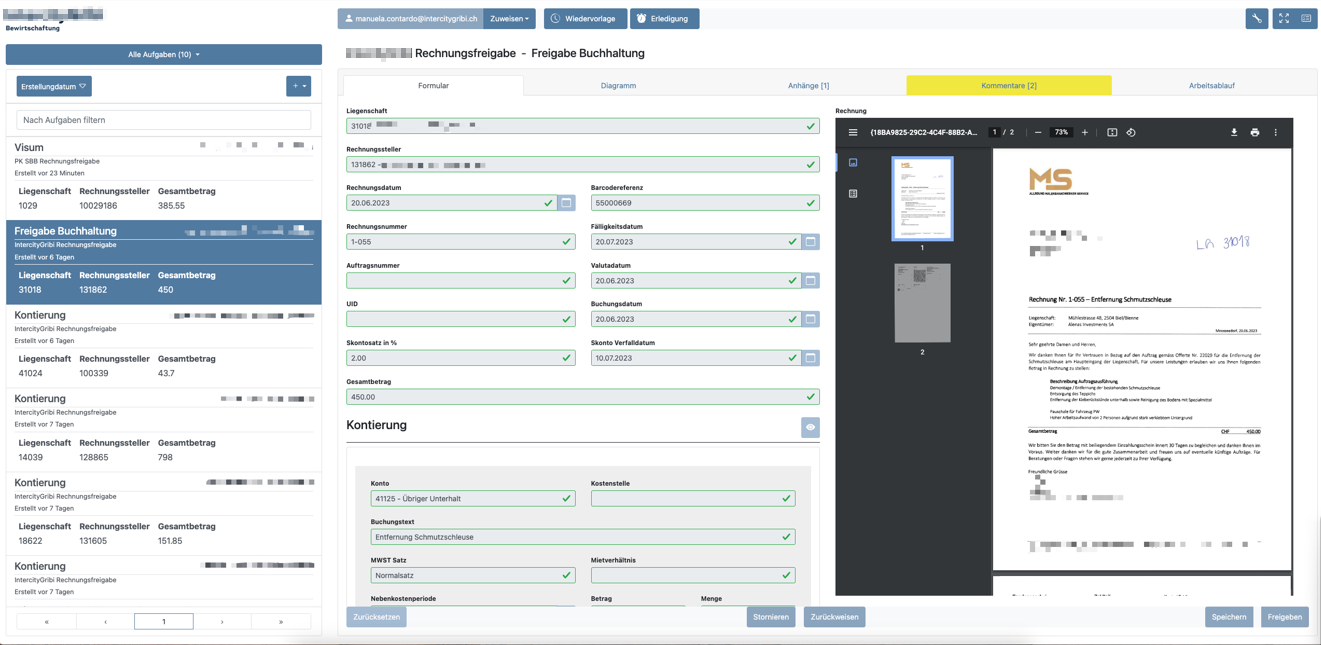 Durch Nutzung unserer Kofax Capture Plattform (CloudCapture) werden alle eingehenden Dokumente mittels automatisierter Texterkennung ausgelesen und an einen webbasierten Kontierungs- und Freigabeprozess weitergeleitet. Nach der teilautomatisierten Kontierung und Freigabe der Rechnungen werden alle Dokumente mit einer digitalen Signatur rechtssicher im entsprechenden Liegenschaftsdossier im Archivsystem abgelegt. Die Zahlungsaufträge werden direkt an das ERP-System weitergeleitet. Die Eigentümer der Liegenschaften haben die Möglichkeit über ein Portal jederzeit alle relevanten Liegenschaftsdokumente einzusehen.