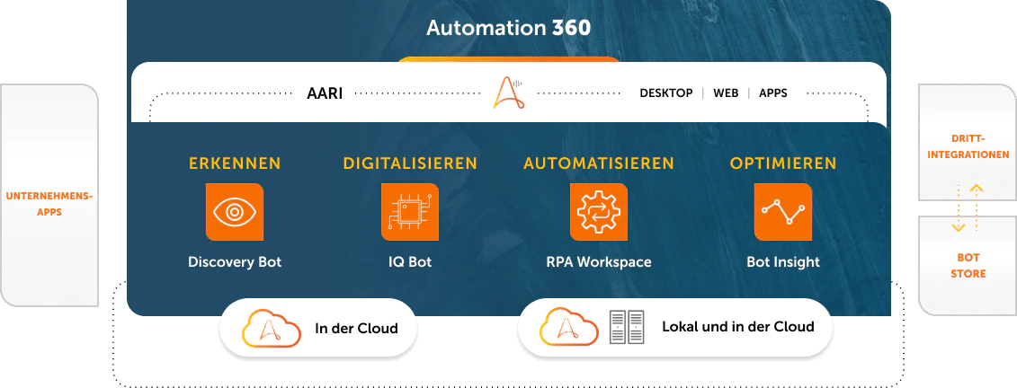 Von Grund auf neu konzipiert, um die erste rein webbasierte Benutzererfahrung zu bieten. Automation 360 - die neueste Version von Automation Anywhere, der wichtigsten Plattform für digitale Arbeitskräfte - bietet Unternehmen zudem die Wahl zwischen OnPremise- und Cloud-Bereitstellung. Es ist die erste Plattform, die RPA-as-a-Service als schlüsselfertige Automatisierungslösung für Unternehmen jeder Grösse anbietet.
